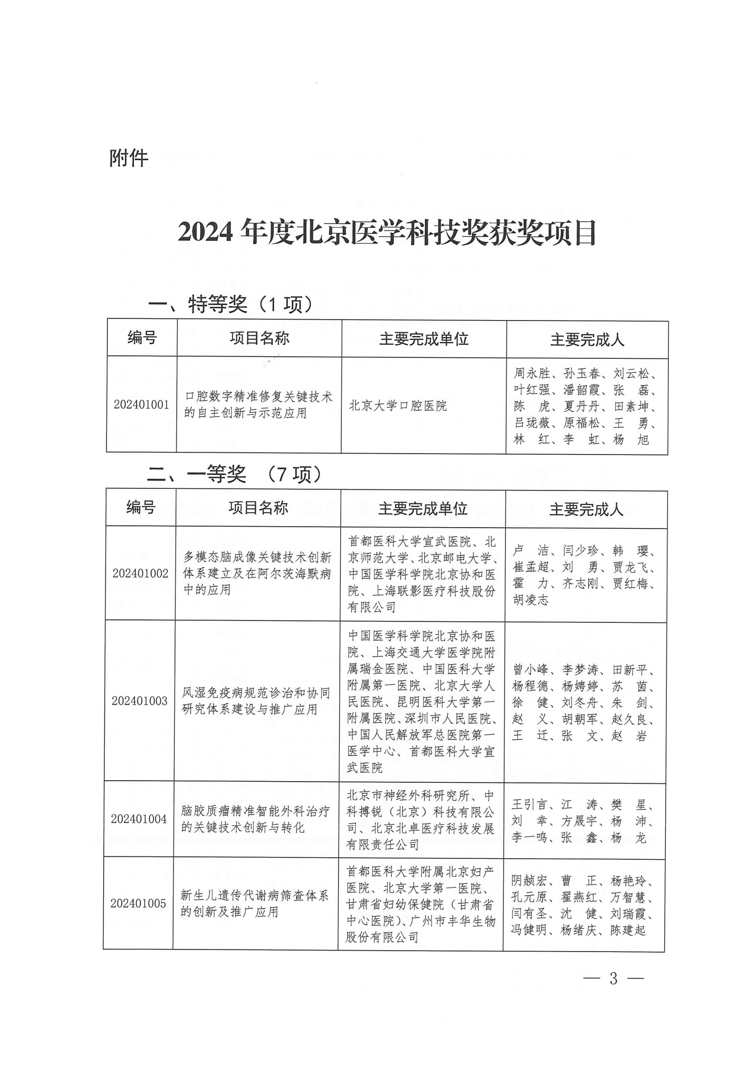北京医学会关于2024年度北京医学科技奖奖励的决定