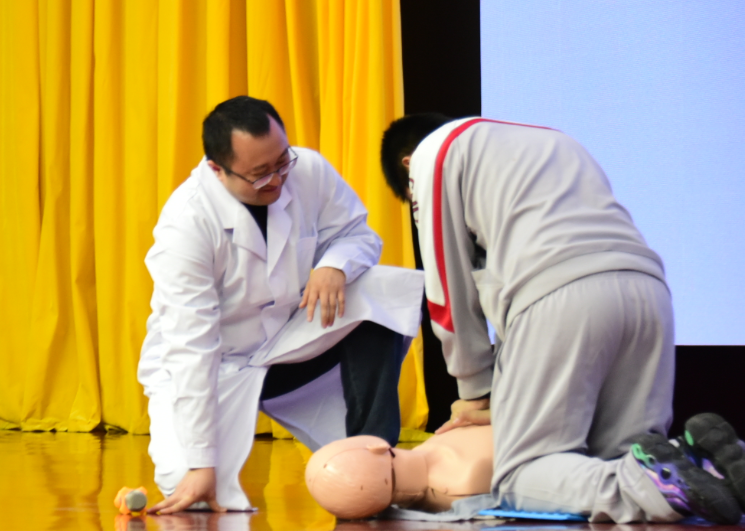 在医生们专业指导下,参会者进行心肺复苏等急救技能的实际训练。